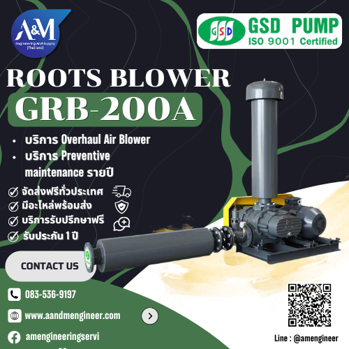 เครื่องเติมอากาศ GSD GRB Series (Root Blower) รุ่น GRB-200A เป็นเครื่องเติมอากาศ ชนิด Root blower ใช้สำหรับเติมอากาศในน้ำเสียในระบบอุตสาหกรรม